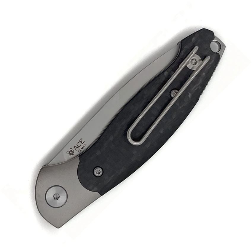 Model/Item/Part Number - GM12597. Giant Mouse Knives - ACE Farley V2 Satin Slip Joint Knife Carbon Fiber Handles. 3.63" (9.22cm) closed. 2.75" (6.99cm) satin finish Elmax steel blade. Carbon fiber handle. Titanium bolster(s). Lanyard hole. Pocket clip. Boxed. Made in Italy.