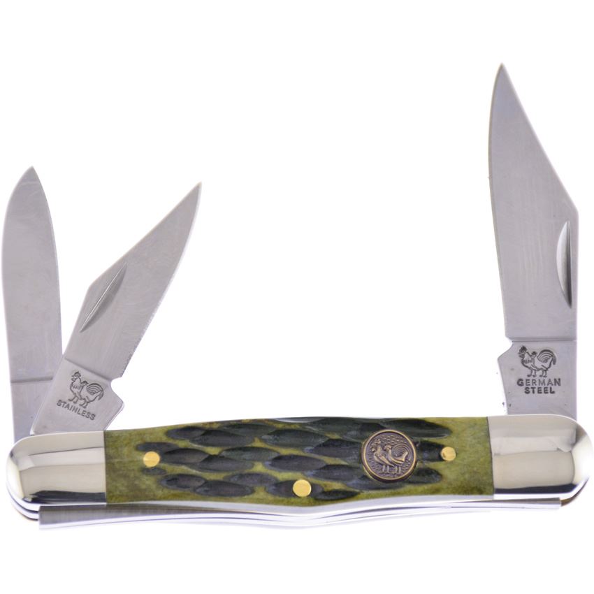 Model/Item/Part Number - HRI123AGB. Hen & Rooster Knives - Whittler Knife Antique Green Bone Handles. 3.75" (9.53cm) closed. Satin finish 1.4116 stainless large clip, small clip, and pen blades. Antique green bone handle. Nickel silver bolster(s). Inlay shield. Boxed. Made in China.