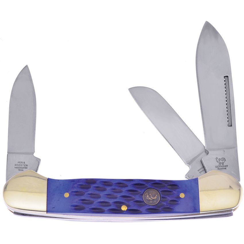 Model/Item/Part Number - HRI353SBLPB. Hen & Rooster Knives - Gunboat Blue Pick Bone Handles. 4.5" (11.43cm) closed. Satin finish 1.4116 stainless spear, pen, and sheepsfoot blades. Blue pick bone handle. Nickel silver bolster(s). Inlay shield. Boxed. Made in China.