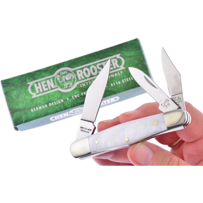 Model/Item/Part Number - HRI123MOP. Hen & Rooster Knives - Whittler Knife MOP Handles. 3.75" (9.53cm) closed. Satin finish 1.4116 stainless large clip, small clip, and pen blades. Mother of pearl handle. Nickel silver bolster(s). Inlay shield. Boxed. Made in China.
