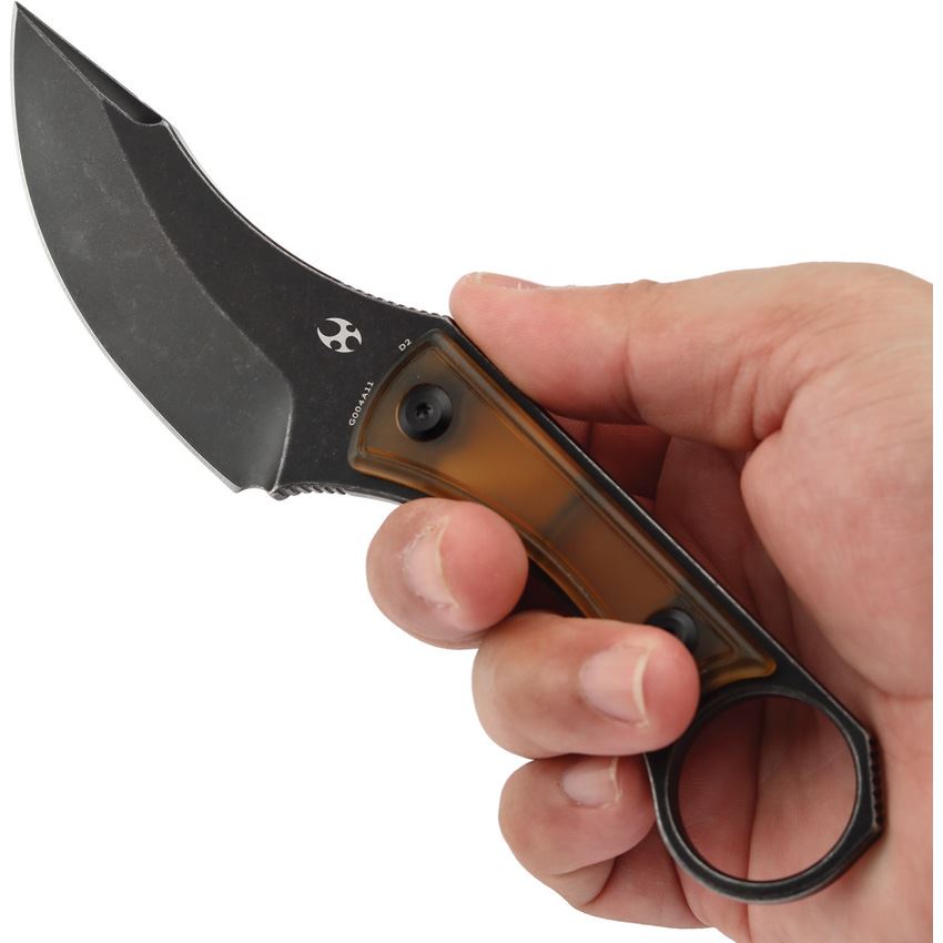 Model/Item/Part Number - KG004A11. Kansept Knives - Niko Black Stonewash Fixed Blade Knife Amber PEI Handles. 7.25" (18.42cm) overall. 3.5" (8.89cm) black stonewash finish D2 tool steel clip point blade. Amber PEI handle. Full, extended tang. Finger ring. Black Kydex belt sheath. Boxed. Made in China.