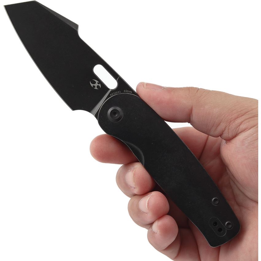 Model/Item/Part Number - K2111A1. Kansept Knives - Orlok Nested Black Stonewash Sheepsfoot Linerlock Knife Black Stonewash Handles. 3.88" (9.86cm) closed. 3" (7.62cm) black stonewash finish CPM S35VN stainless sheepsfoot blade. Black stonewash finish titanium handle. Extended tang. Thumb pull. Pocket clip. Boxed. Made in China.