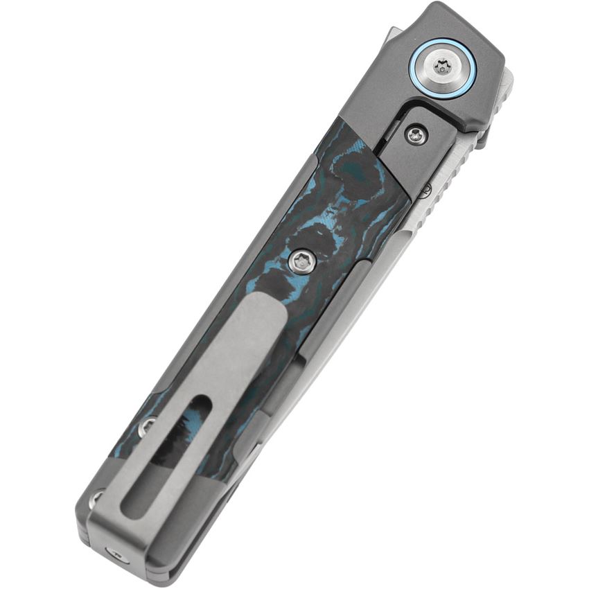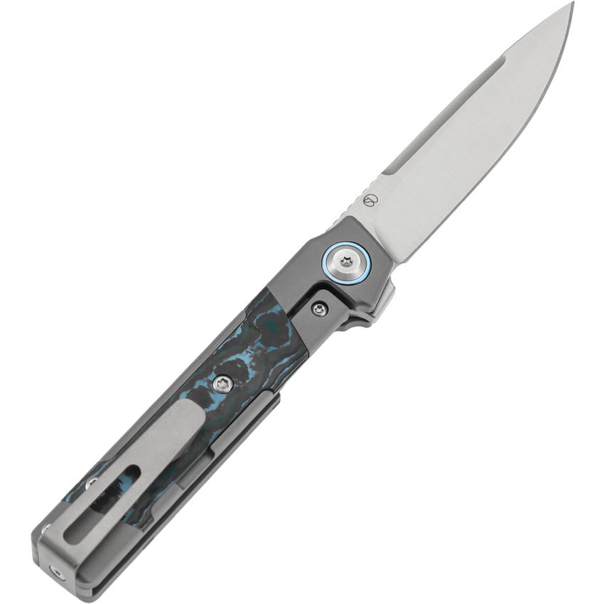 Model/Item/Part Number - K2123A2. Kansept Knives - Kitpu Satin Framelock Knife Arctic Storm Handles. 3.75" (9.53cm) closed. 2.9" (7.37cm) satin finish CPM-20CV stainless blade. Stonewash finish titanium handle with Arctic Storm Fat carbon fiber inlay. Extended tang. Pocket clip. Black nylon pouch. Boxed. Made in China.