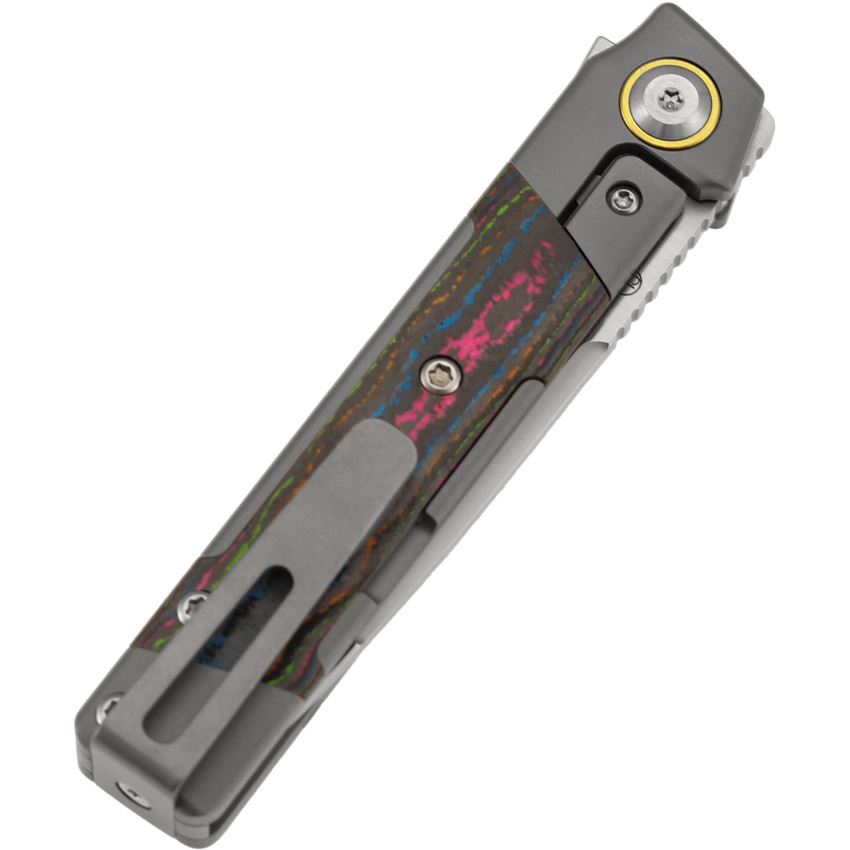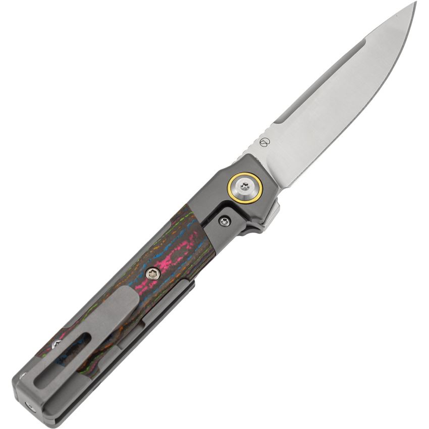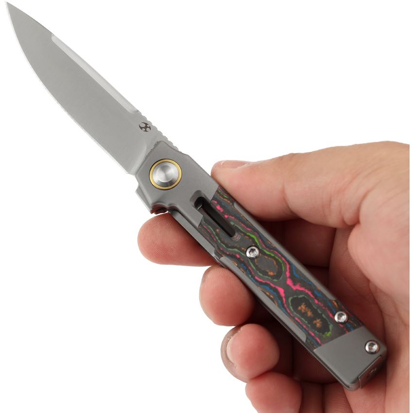 Model/Item/Part Number - K2123A3. Kansept Knives - Kitpu Satin Framelock Knife 80s Camo Handles. 3.75" (9.53cm) closed. 2.9" (7.37cm) satin finish CPM-20CV stainless blade. Stonewash finish titanium handle with 80's Camo carbon fiber inlay. Extended tang. Pocket clip. Black nylon pouch. Boxed. Made in China.