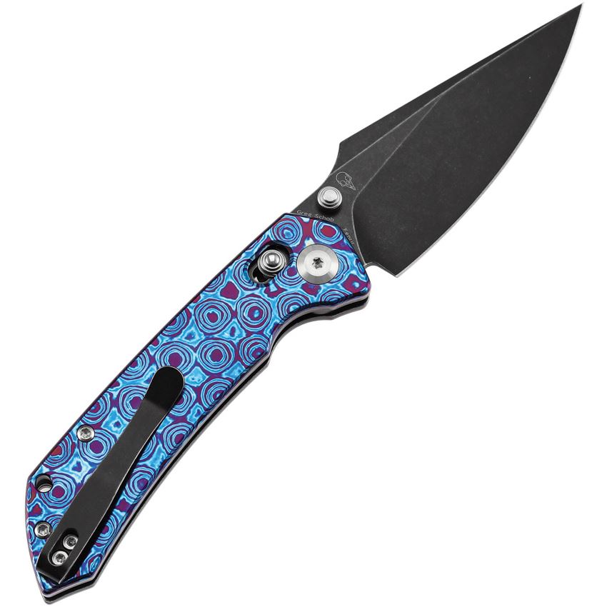 • Kansept Knives - Fenrir Black Stonewash Wharncliffe CrossBar Lock Knife Timascus Handles