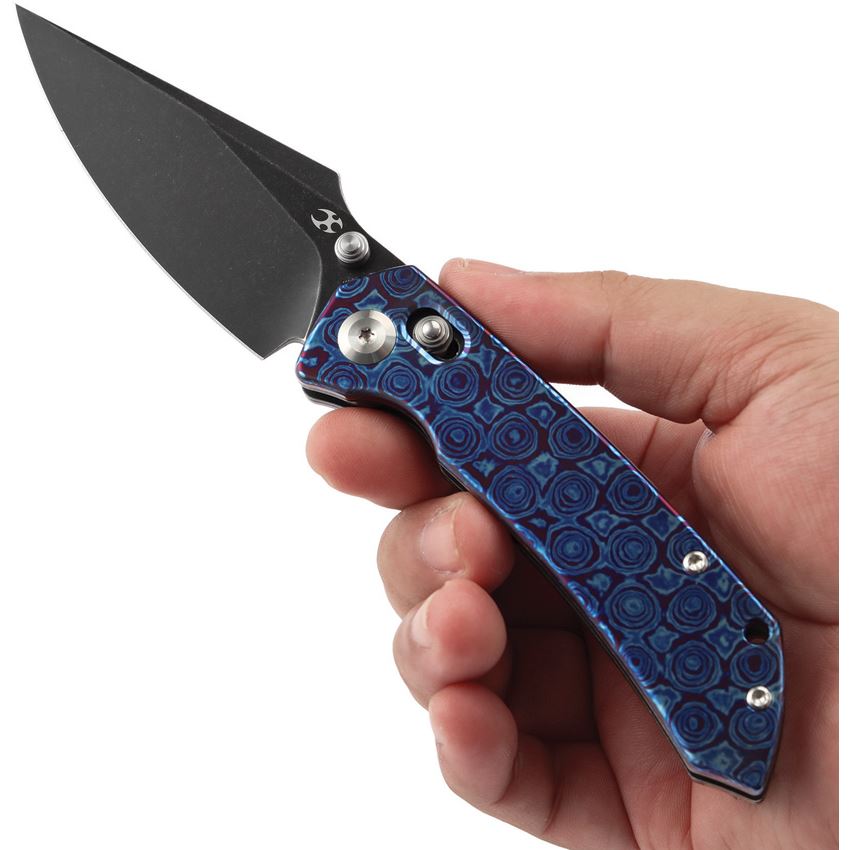 Model/Item/Part Number - K1034V6. Kansept Knives - Fenrir Black Stonewash Wharncliffe CrossBar Lock Knife Timascus Handles. 4.5" (11.43cm) closed. 3.5" (8.89cm) black stonewash finish CPM S35VN stainless Wharncliffe blade. Timascus handle. Thumb stud. Lanyard hole. Pocket clip. Black nylon pouch. Boxed. Made in China.