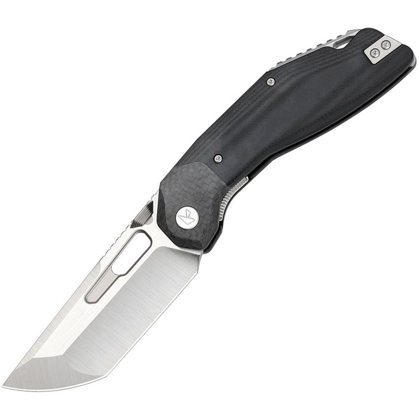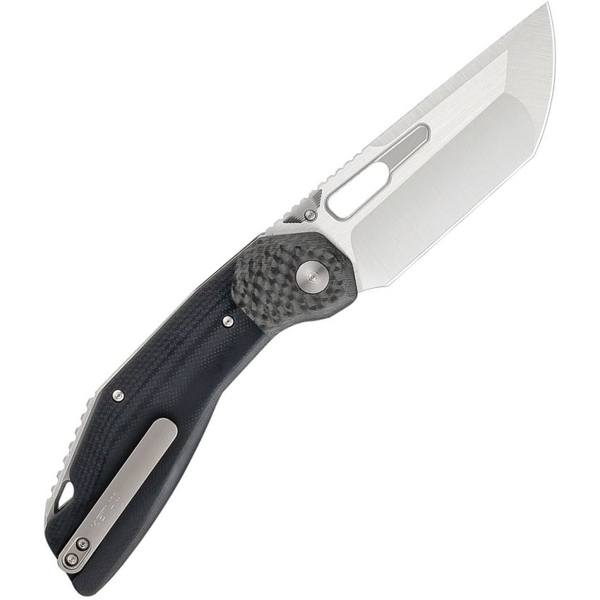 Model/Item/Part Number - KETM059. Ketuo Cutlery - Yakuza Satin Tanto Linerlock Knife Black G10 Handles. 4.38" (11.13cm) closed. 3.38" (8.59cm) satin finish 14C28N Sandvik stainless tanto blade. Black G10 handle. Carbon fiber bolster(s). Thumb disk. Thumb pull. Lanyard hole. Pocket clip. Boxed. Made in China.