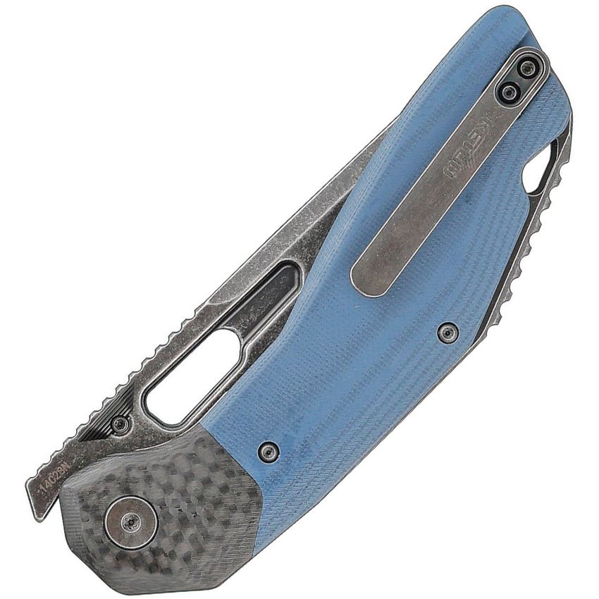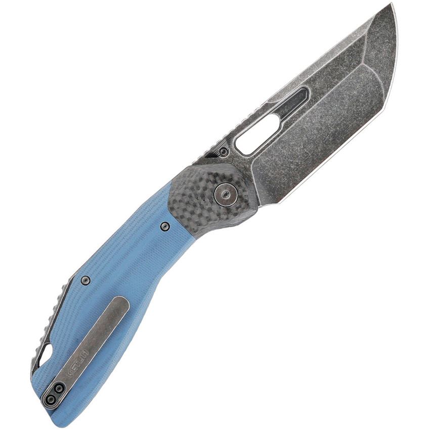 Model/Item/Part Number - KETM062. Ketuo Cutlery - Yakuza Black Stonewash Tanto Linerlock Knife Blue G10 Handles. 4.38" (11.13cm) closed. 3.38" (8.59cm) black stonewash finish 14C28N Sandvik stainless tanto blade. Blue G10 handle. Carbon fiber bolster(s). Thumb disk. Thumb pull. Lanyard hole. Pocket clip. Boxed. Made in China.
