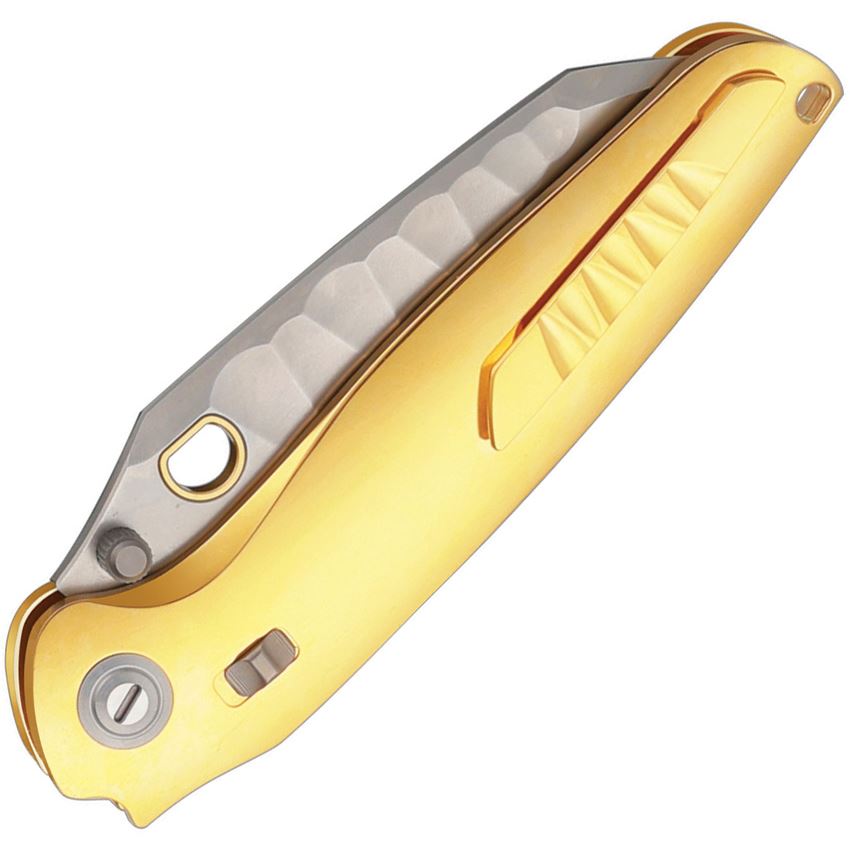 Model/Item/Part Number - KETM064. Ketuo Cutlery - Dirty Bird Button Lock Knife Gold Handles. 5.13" (13.03cm) closed. 3.75" (9.53cm) bead blast finish Bohler M390 stainless blade. Gold polished titanium handle. Thumb stud. Lanyard hole. Pocket clip. Zircuti handle inlay. Safety lock. Boxed. Made in China.