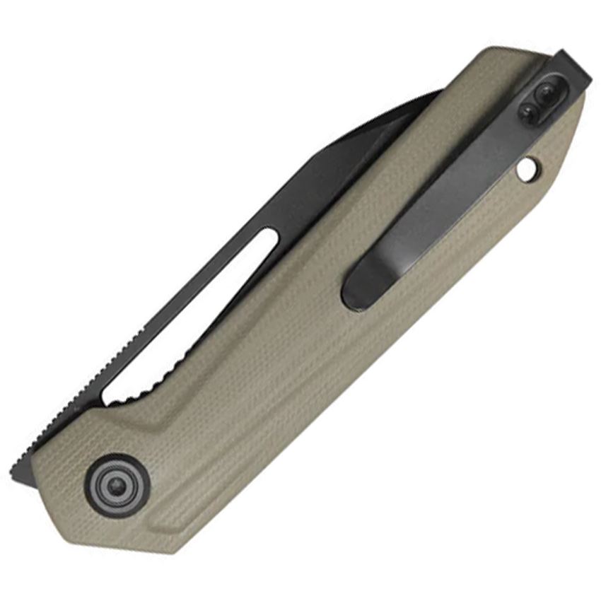 Model/Item/Part Number - KUB321V. Kubey Knives - RoyalBlack Stonewash Linerlock Knife Khaki G10 Handles. 4.25" (10.8cm) closed. 3" (7.62cm) black stonewash finish 14C28N Sandvik stainless blade. Khaki G10 handle. Extended tang. Thumb pull. Lanyard hole. Pocket clip. Boxed. Made in China.