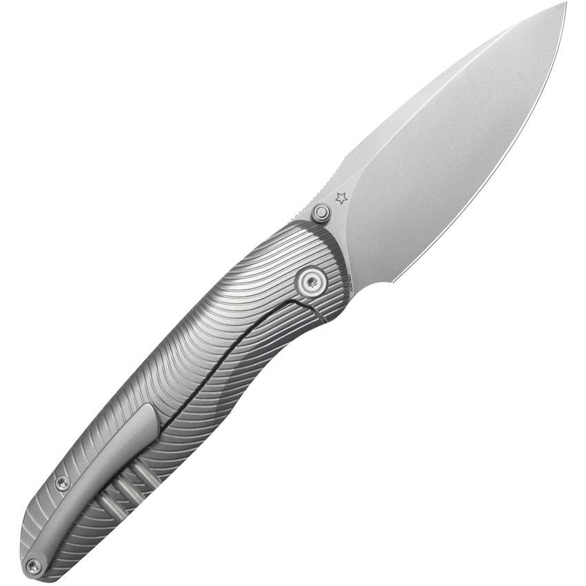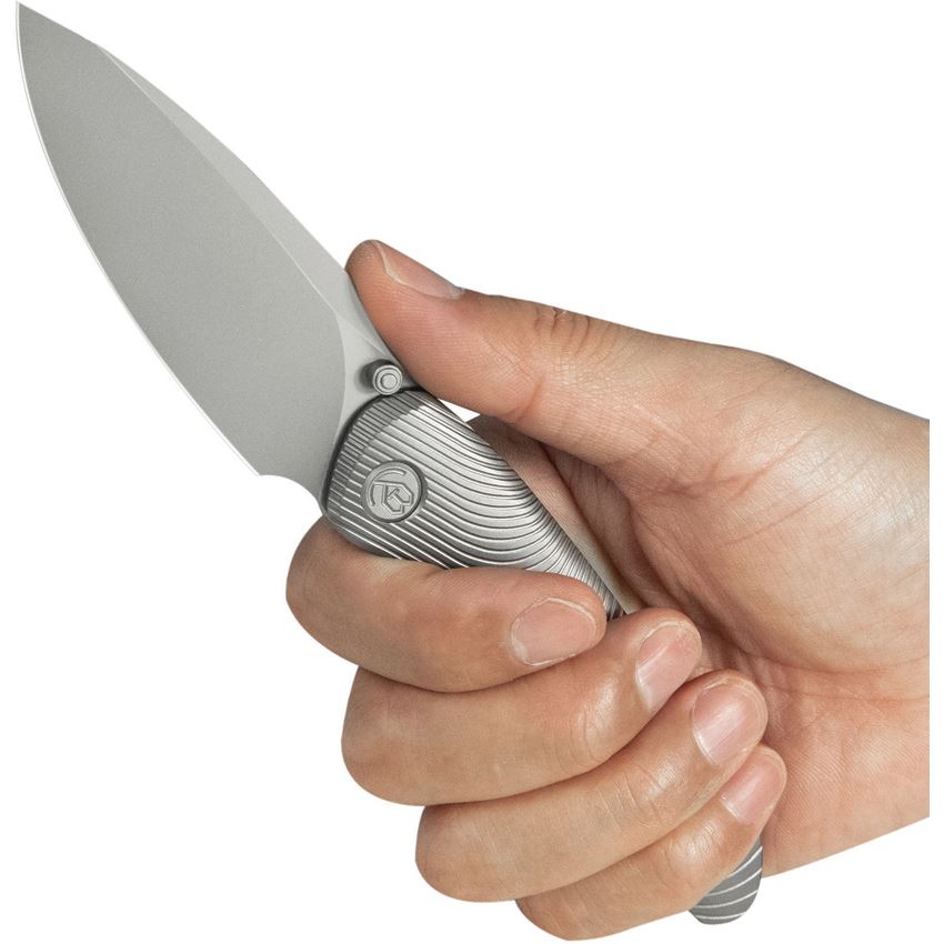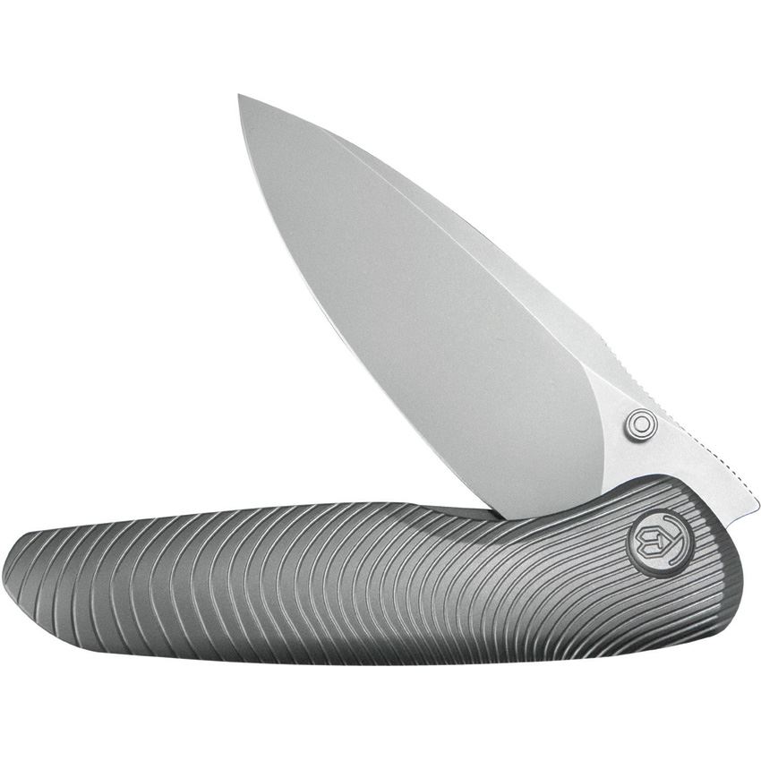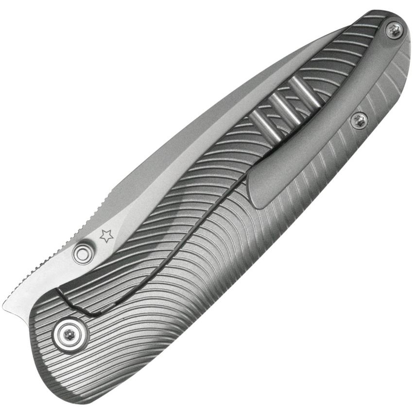 Model/Item/Part Number - KUB379A. Kubey Knives - Pioneer Beabd Blast Framelock Knife Gray Titanium Handles. 4.5" (11.43cm) closed. 3.38" (8.59cm) bead blast finish CPM-20CV stainless blade. Gray sculpted titanium handle. Extended tang. Thumb stud. Pocket clip. Boxed. Made in China.