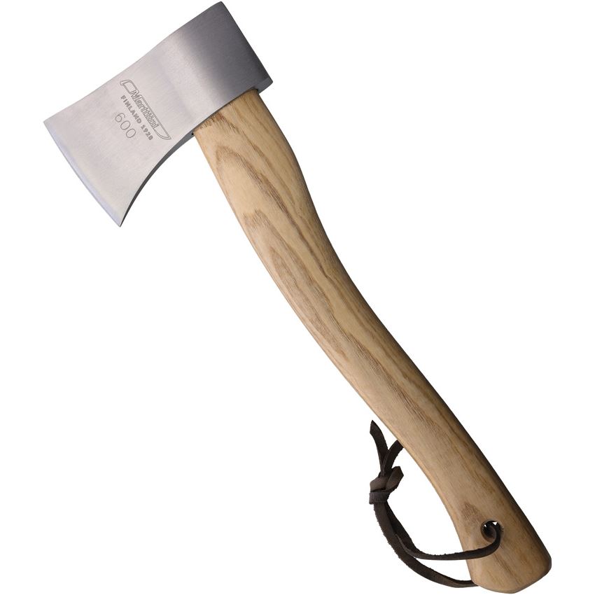 Model/Item/Part Number - MN1031030. Marttiini Knives - Camping Axe Ash Wood Handles. 15.13" overall. 5.13" carbon steel axe head with 3.13" cutting edge. Lanyard hole. Ash wood handle. 600g axe head. Brown leather belt sheath. Bulk packed. Made in Italy.