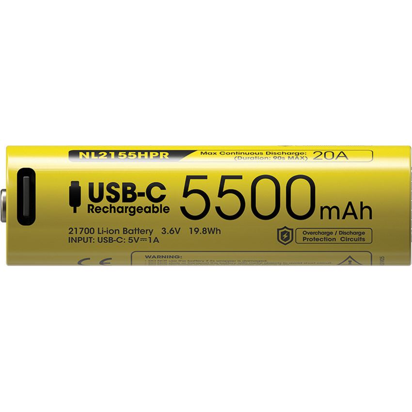 Model/Item/Part Number - NCNL2155HPR. NITECORE Lights - 21700 Rechargeable Battery. 5500mAh capacity. Continuous 20A discharge current. Features overcharge/discharge protection circuits. Waterproof. USB-C rechargeable. Clam packed. Made in China.