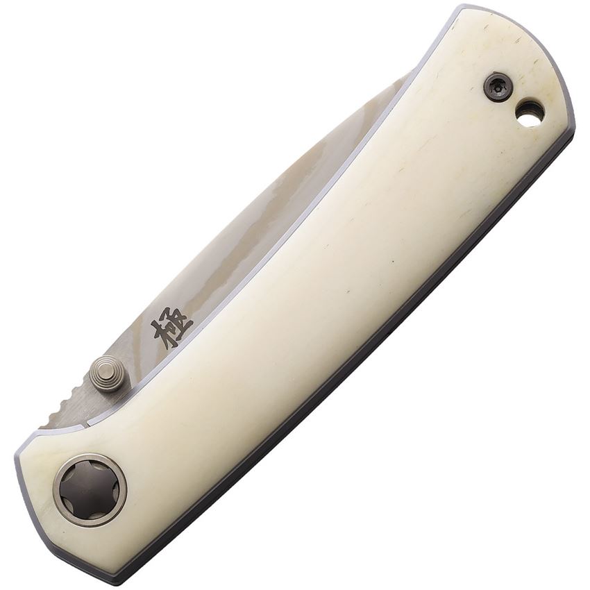Model/Item/Part Number - NMB2528CB. North Mountain Blade Company - Ultra Linerlock Knife Natural Smooth Bone Handles. 3.75" (9.53cm) closed. 2.75" (6.99cm) blade. Natural smooth bone handle. Thumb stud. Lanyard hole. ZDP-189 stainless blade. Plastic storage case. Boxed. Made in China.