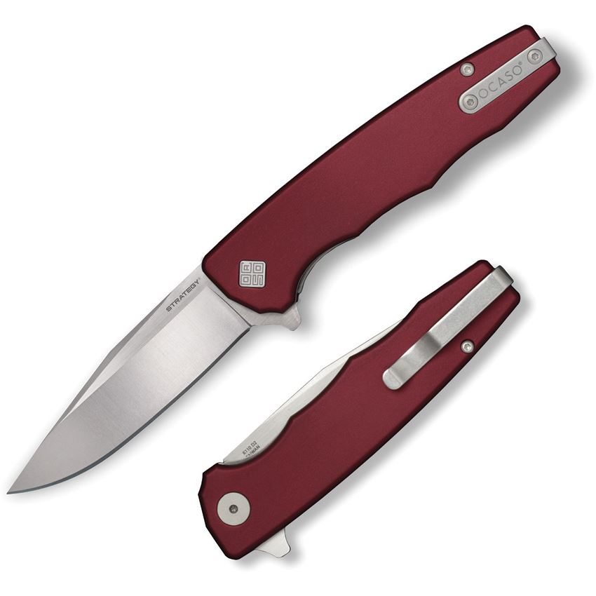 Model/Item/Part Number - OCA29RDS. Ocaso Knives - Strategy Satin D2 Clip Point Linerlock Knife Red Aluminum Handles. 4.38" (11.13cm) closed. 3.5" (8.89cm) satin finish D2 tool steel clip point blade. Red aluminum handle. Extended tang. Pocket clip. Boxed. Made in Taiwan.
