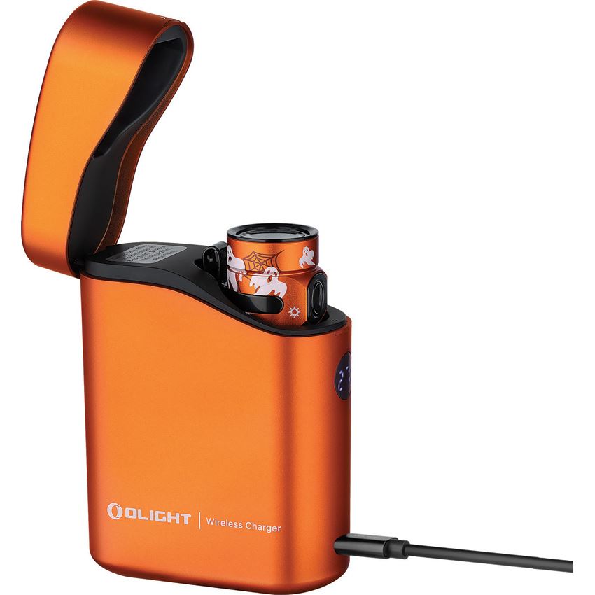 Model/Item/Part Number - OLTBATON4KITSW. Olight - Baton 4 Flashlight Kit Spook. 2.5" overall. Water resistant.Impact resistant.Clip.Rechargeable.Lanyard. Modes: Turbo (1300-600-300 lumens, 1.5+2.5+73m runtime); High (600-300-60 lumens, 7+72+16m runtime); Medium (60 lumens, 8h runtime); Low (12 lumens, 35h runtime); Moonlight (0.5 lumens, 30 day runtime). Push button switches on light and case. Premium edition which includes a customized wireless charger that can also be used as a USB-C power bank. Requires (1) Lithium battery (included). Aluminum construction. Color: Spooky web. Boxed. Made in China.