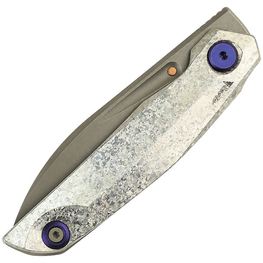 Model/Item/Part Number - REA211. Reate Knives - VK Anub Gray Stonewash Framelock Knife Crystal Titanium Handles. 4.5" (11.43cm) closed. 3.25" (8.26cm) gray stonewash finish Elmax steel blade. Crystalized silver titanium handle. Extended tang. Pocket clip. Purple accents. Boxed. Made in China.