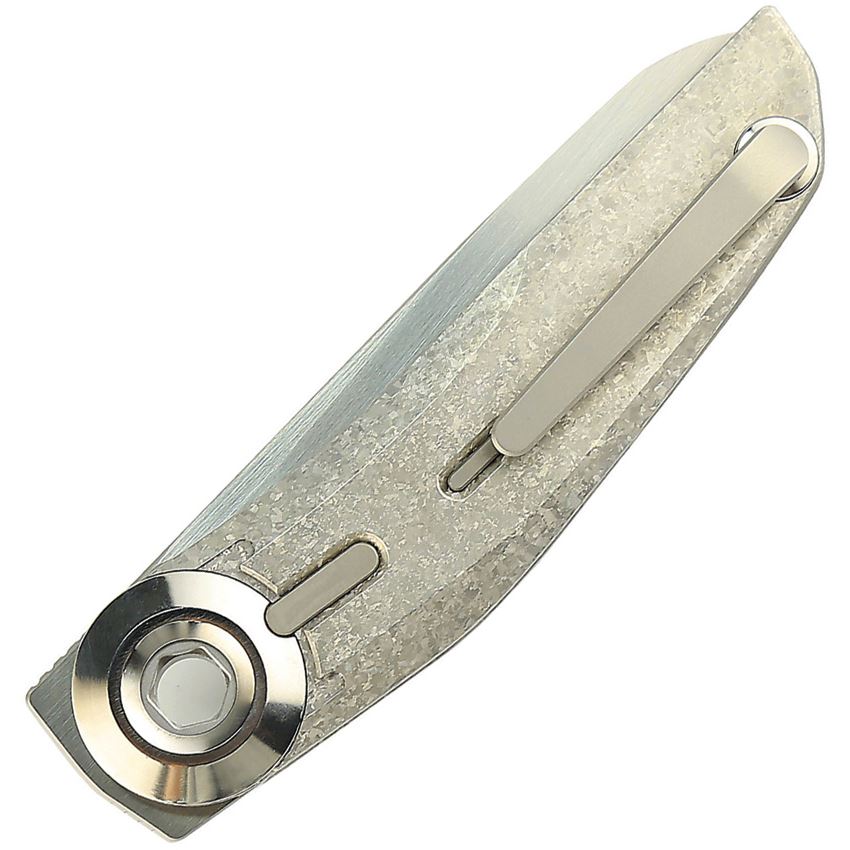 Model/Item/Part Number - REA218. Reate Knives - VK Tron Satin Detent Action Lock Knife Crystal Handles. 4.5" (11.43cm) closed. 3.5" (8.89cm) satin finish Bohler M390 stainless blade. Crystalized silver titanium handle. Pocket clip. Extended tang. Boxed. Made in China.
