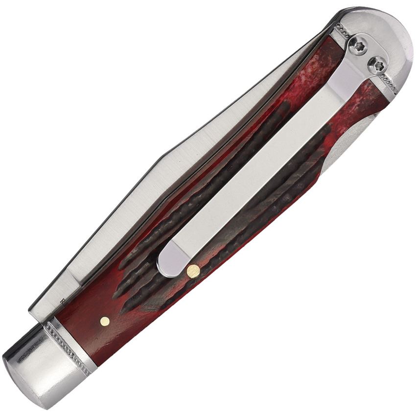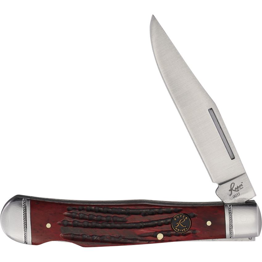 Model/Item/Part Number - RP0005CRB. Roper Knives - Lockback Trapper Knife Red Bone Handles. 4.13" (10.49cm) closed. Satin finish 1065 carbon steel clip blade. Red jigged bone handle. Stainless bolster(s). Inlay shield. Pocket clip. Boxed. Made in China.