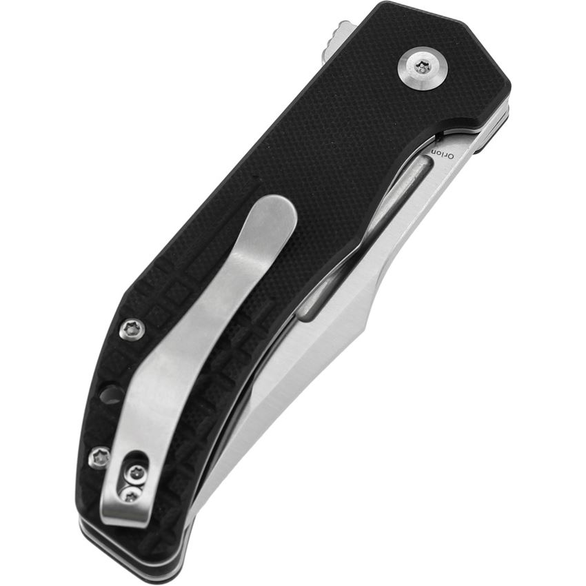 Model/Item/Part Number - TB1089A6. Tenable Knives - Orion Satin Clip Point Linerlock Knife Black G10 Handles. 4.13" (10.49cm) closed. 3.13" (7.95cm) satin finish 14C28N Sandvik stainless clip point blade. Black G10 handle. Extended tang. Lanyard hole. Pocket clip. Boxed. Made in China.