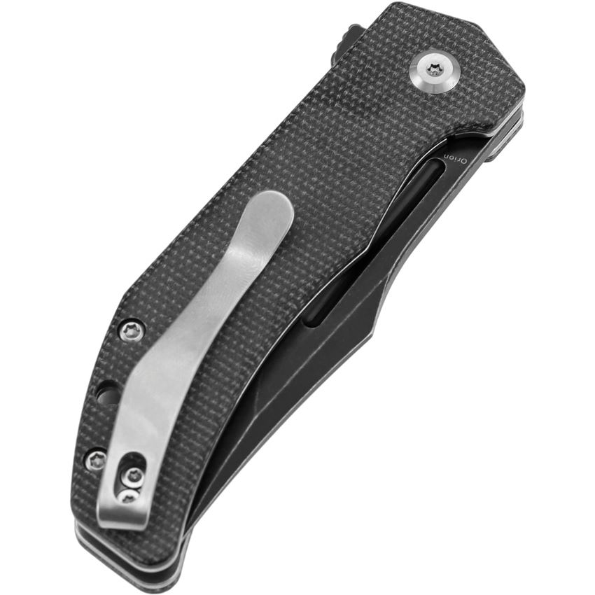 Model/Item/Part Number - TB1089A4. Tenable Knives - Orion Black Stonewash Clip Point Linerlock Knife Black Micarta Handles. 4.13" (10.49cm) closed. 3.13" (7.95cm) black stonewash finish 14C28N Sandvik stainless clip point blade. Black canvas micarta handle. Extended tang. Lanyard hole. Pocket clip. Boxed. Made in China.