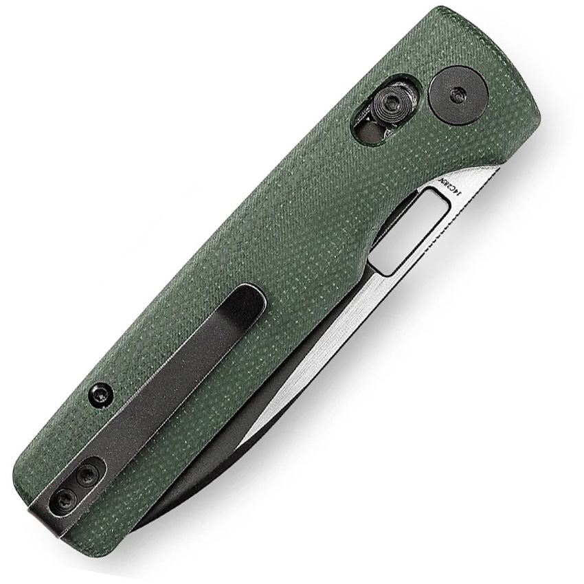 Model/Item/Part Number - TVTY29GM14. Trivisa Knives - Sabretooth Two-Tone Drop Point CrossBar Lock Knife Green Micarta Handles. 4.38" (11.13cm) closed. 3.38" (8.59cm) black stonewash and satin finish 14C28N Sandvik stainless drop point blade. Green canvas micarta handle. Thumb pull. Pocket clip. Boxed. Made in China.