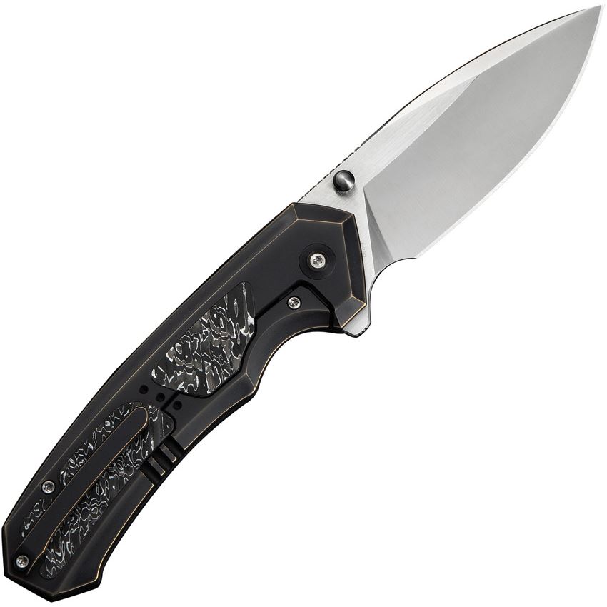 Model/Item/Part Number - WE240883. WE Knife Company - Corwyn Satin Drop Point Framelock Knife Alum Foil Carbon Fiber Handles. 5.25" (13.34cm) closed. 3.75" (9.53cm) satin finish Bohler M390 stainless drop point blade. Black and bronze titanium handle with Aluminum foil carbon fiber inlay. Extended tang. Thumb stud. Pocket clip. Black nylon zippered storage case. Boxed. Made in China.