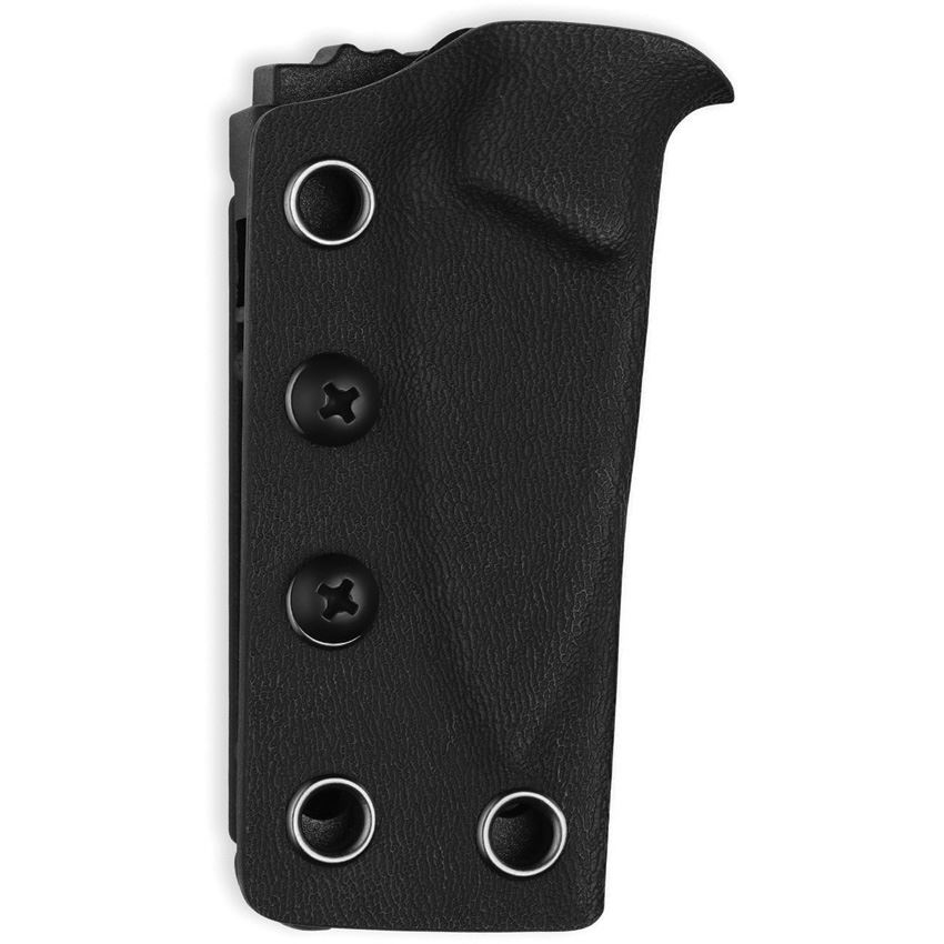 Model/Item/Part Number - KI1108A3. Kizer Whiskey Jack Satin Drop Point Fixed Blade Knife Black G10 Handles Black/Green Damascus pattern G-Mascus inlay. 5.63" (14.3cm) overall. 2.13" (5.41cm) satin finish AEB-L stainless drop point blade. Black G10 handle with Black and green Damascus pattern G-Mascus inlay. Full, extended tang. Lanyard hole. Black Kydex belt sheath. Boxed. Made in China