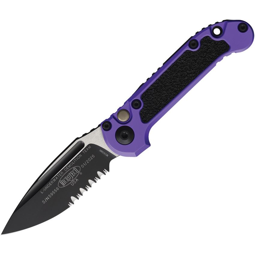 Model/Item/Part Number - MCT11352PU. Microtech Auto LUDT Button Lock GenIII Two-Tone Part Serrated Purple Aluminum Handle. Automatic opening. 4.5" (11.43cm) closed. 3.5" (8.89cm) two-tone finish partially serrated Bohler M390MK stainless drop point blade. Purple aluminum handle with black traction insert. Lanyard hole. Pocket clip. Boxed. Made in the USA.