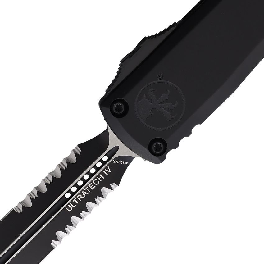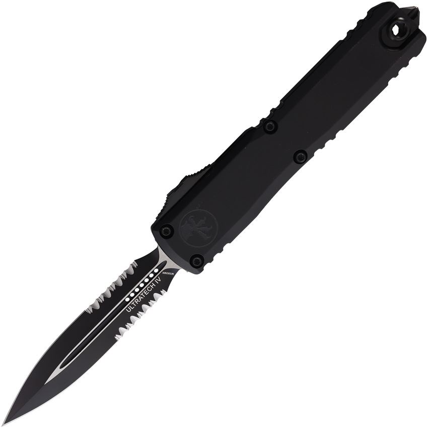 Model/Item/Part Number - MCT112242T. Microtech Auto Ultratech Gen IV OTF Two-Tone Part Serrated Dagger Black Aluminum Handle. Automatic opening. 5" (12.7cm) closed. 3.5" (8.89cm) two-tone finish partially serrated Bohler M390MK stainless dagger blade. Black aluminum handle. Pocket clip. Lanyard hole. Glass breaker. Boxed. Made in the USA.