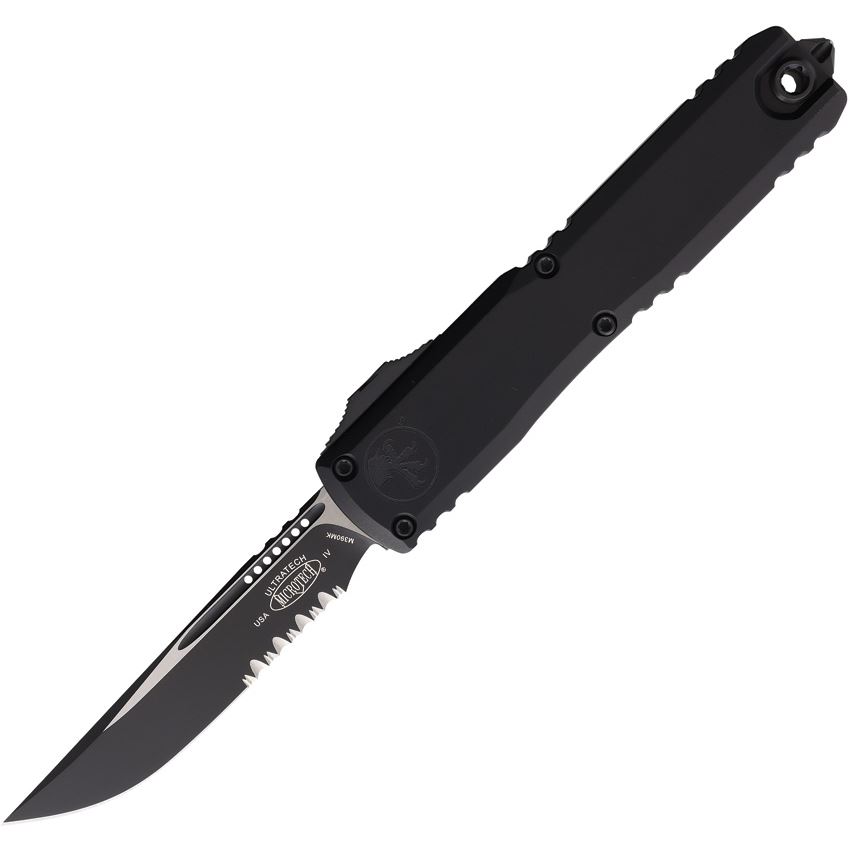 Model/Item/Part Number - MCT112142T. Microtech Auto Ultratech Gen IV OTF Two-Tone Part Serrated Black Aluminum Handle. Automatic opening. 5" (12.7cm) closed. 3.5" (8.89cm) two-tone finish partially serrated Bohler M390MK stainless blade. Black aluminum handle. Glass breaker. Lanyard hole. Pocket clip. Boxed. Made in the USA.