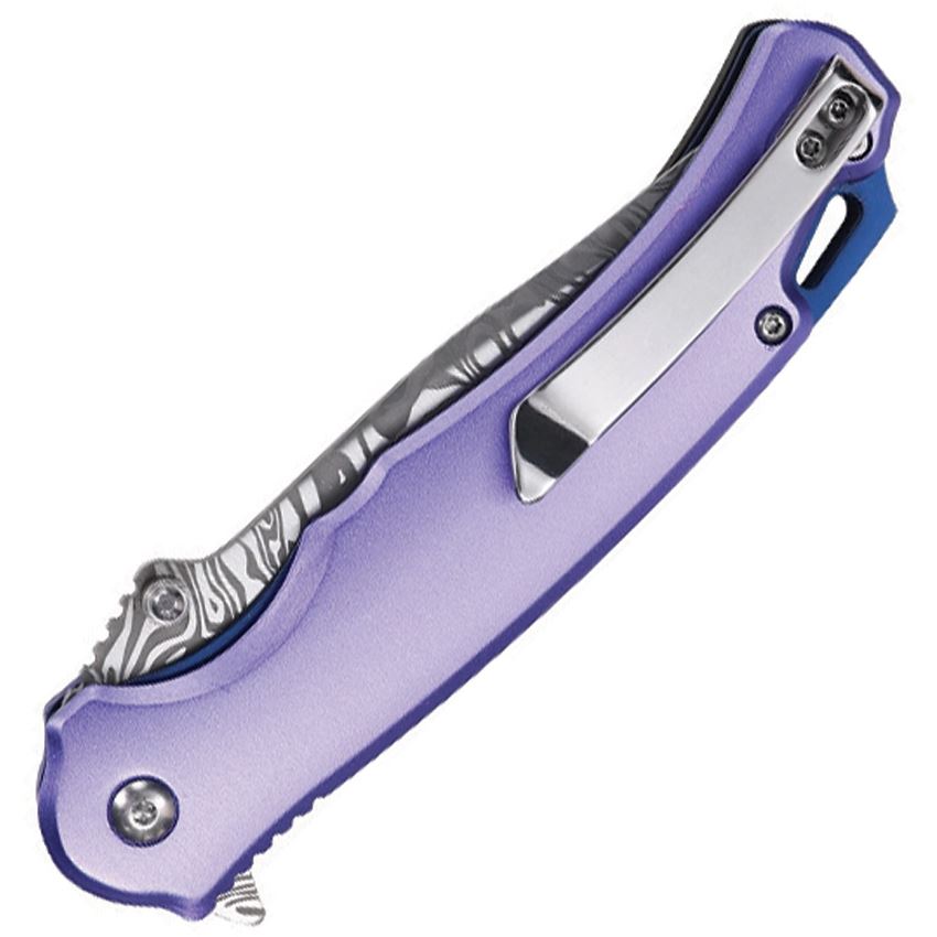 Model/Item/Part Number - TF2009BL. Tac Force Asisst Opening Linerlock Knife Purple Aluminum Handle. Assisted opening. 4.88" (12.4cm) closed. 3.88" (9.86cm) 3Cr13MoV stainless blade. Purple aluminum handle with black wood inlay. Extended tang. Thumb stud. Lanyard hole. Pocket clip. Acid etched finish blade. Boxed. Made in China.