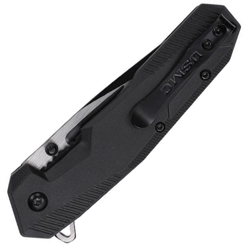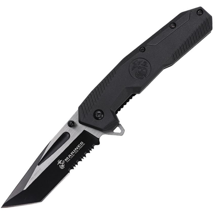 Model/Item/Part Number - USMA3007BK. USMC Assist Open Two-Tone Part Serrated Tanto Linerlock Knife Black Black Nylon Handle. Assisted opening. 4.5" (11.43cm) closed. 3.38" (8.59cm) two-tone finish partially serrated stainless tanto blade. Black nylon handle. Extended tang. Thumb stud. Pocket clip. Boxed. Made in China.