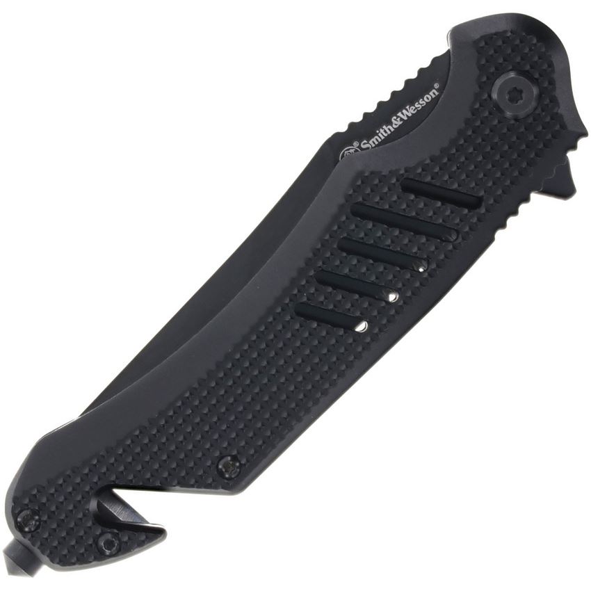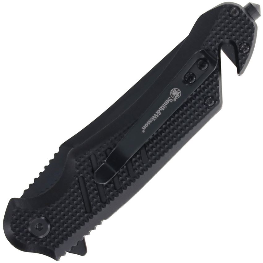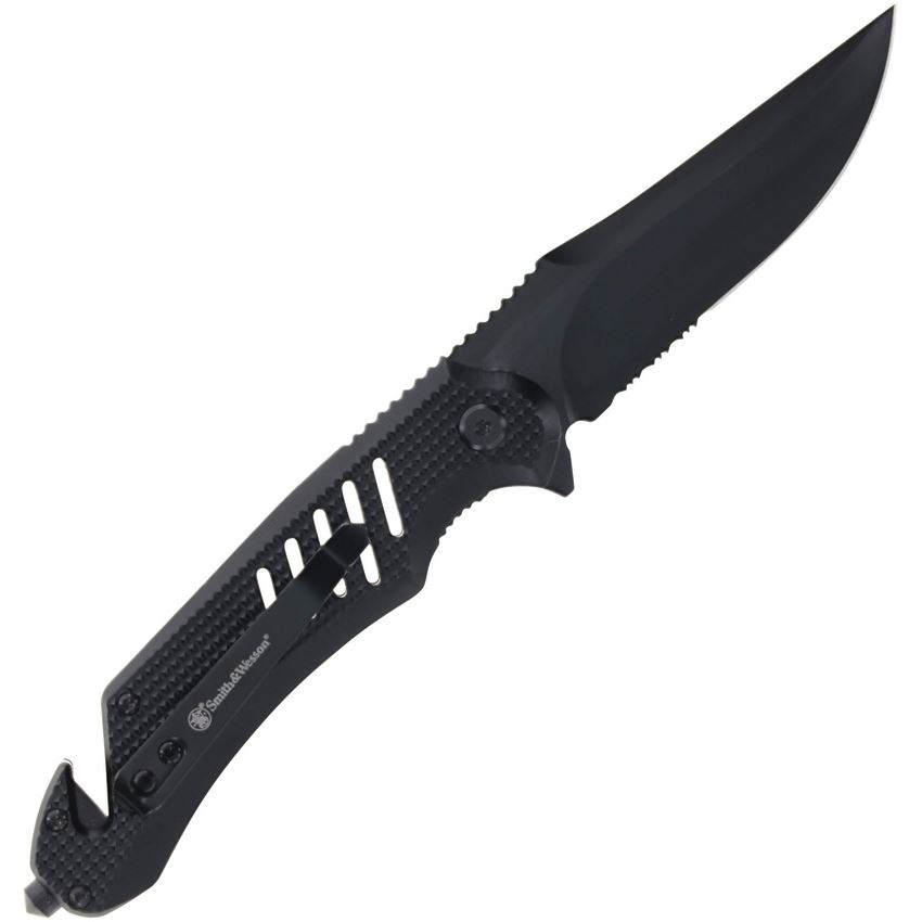Model/Item/Part Number - SW1227058. Smith & Wesson Extreme Ops Black Part Serrated Clip Point Linerlock Knife Black Aluminum Handle. 4.75" (12.07cm) closed. 3.5" (8.89cm) black finish partially serrated stainless clip point blade. Black textured aluminum handle. Extended tang. Thumb stud. Belt/cord cutter. Glass breaker. Pocket clip. Boxed. Made in China.