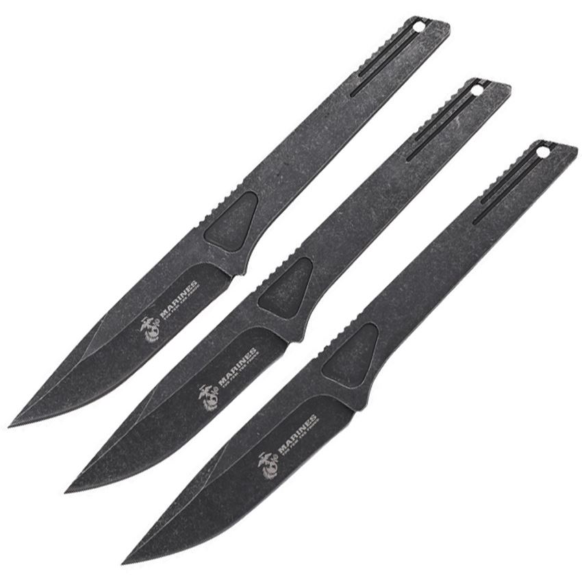 Model/Item/Part Number - USMT3002BK. USMC Throwing Knife Set BSW. 7.5" (19.05cm) overall. 3" (7.62cm) black stonewash finish stainless blade. One-piece construction. Lanyard hole. Black nylon belt sheath. Boxed. Made in China.
