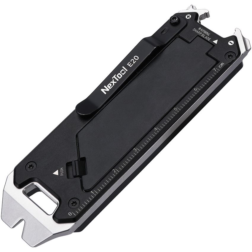 Model/Item/Part Number - NTL20398. NexTool Explorer E20 Multi Tool. 4.13" closed. 4.75" overall. Black aluminum handles. Tools include: Nail puller l Lanyard loop l Pry bar l Pocket clip l Ruler l Flat head screwdriver l Bottle opener l Phillips screwdriver. Replaceable SK5 blade. Boxed with hanging tab. Made in China.