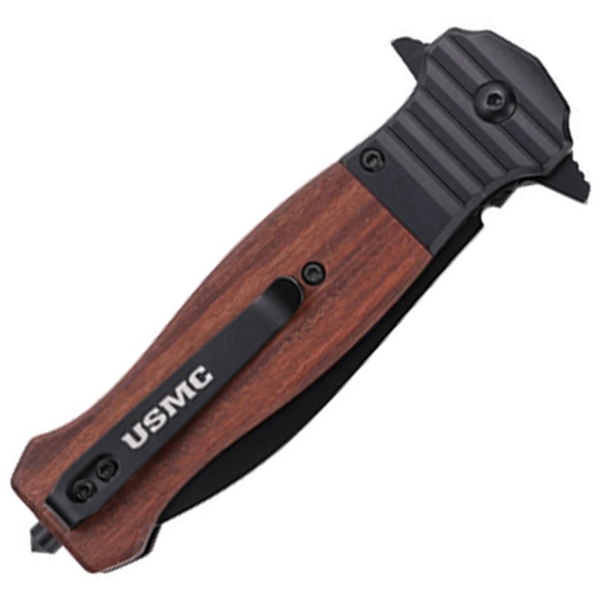 Model/Item/Part Number - USM3011WD. USMC Black Oxide Spear Point Linerlock Knife Brown Wood Handle. 4.75" (12.07cm) closed. 3.5" (8.89cm) black oxide coated stainless spear point blade. Brown wood handle. Stainless bolster(s). Extended tang. Glass breaker. Pocket clip. Boxed. Made in China.
