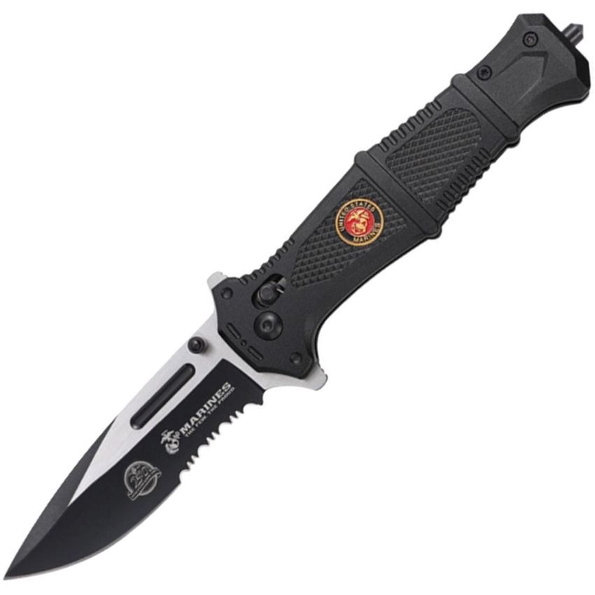 Model/Item/Part Number - USM3010BK. USMC Rapid Lock Black. 5" (12.7cm) closed. 3.9" (9.91cm) two-tone finish partially serrated stainless blade. Black anodized aluminum handle. Glass breaker. Extended tang. Thumb stud. Pocket clip. Boxed. Made in China.