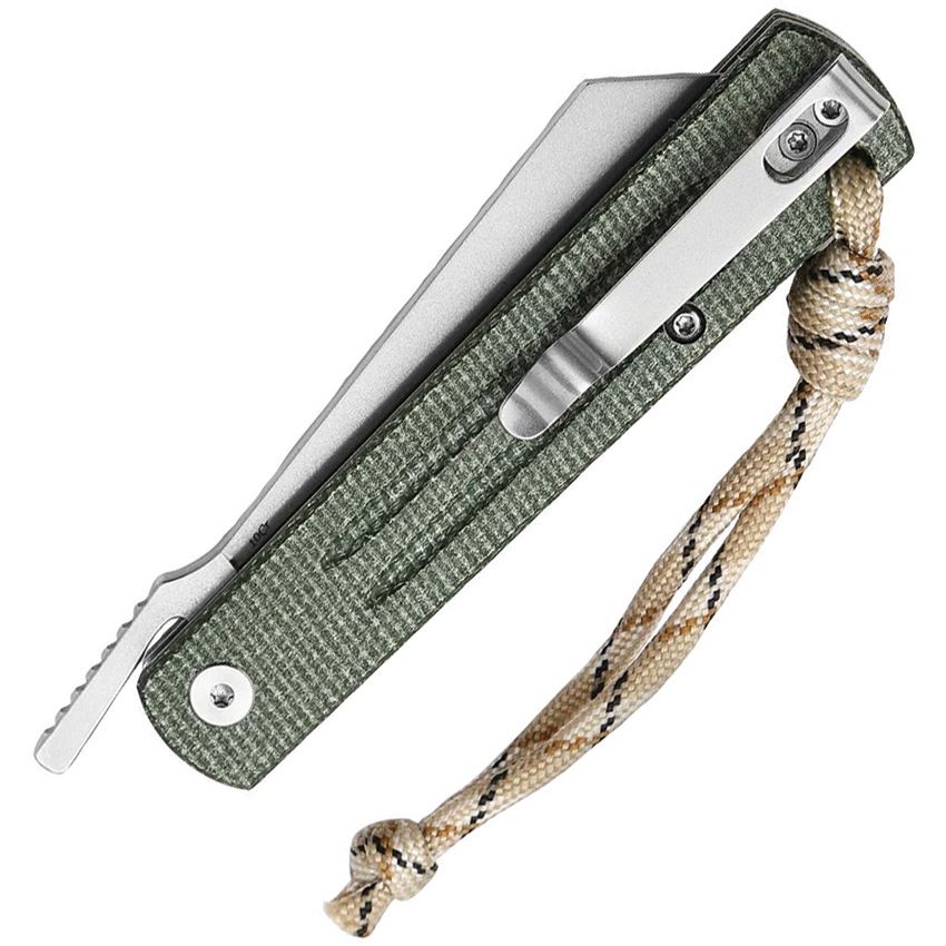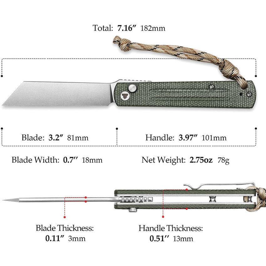 Model/Item/Part Number - TVTY11GM10. Trivisa Hydra Button Stonewash Lock Knife Green Micarta Handle. 4"" (10.16cm) closed. 3.25"" (8.26cm) stonewash finish 10Cr15CoMoV stainless blade. Green canvas micarta handle. Extended tang. Lanyard hole. Pocket clip. Boxed. Made in China.