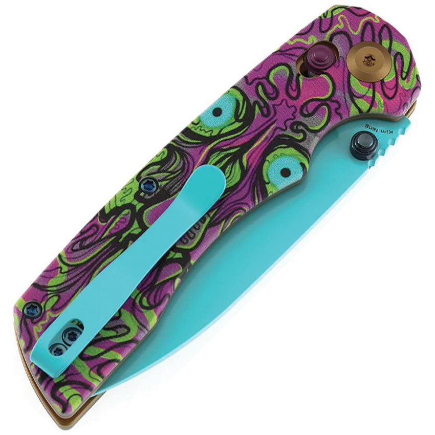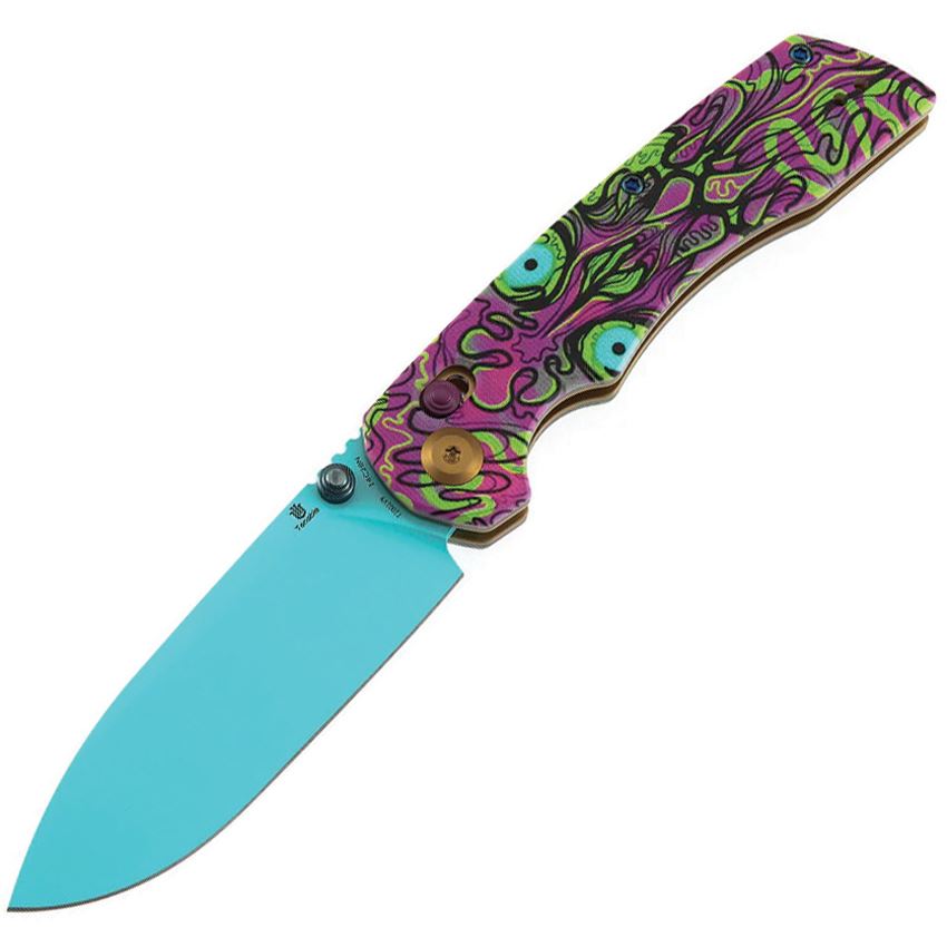 Model/Item/Part Number - T1001V9. Tenable Kryo Blue Sandvik Drop Point Crossbar Lock Knife Purple Undead Jade Handle. 4.5" (11.43cm) closed. 3.5" (8.89cm) blue coated 14C28N Sandvik stainless drop point blade. Jade G10 handle. Thumb stud. Pocket clip. Purple Undead print handle. Boxed. Made in China.