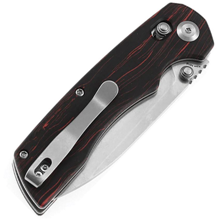Model/Item/Part Number - T1001V11. Tenable Kryo Stonewash Sandvik Drop Point Crossbar Lock Knife Black/Red G10 G-Mascus Handle. 4.5" (11.43cm) closed. 3.5" (8.89cm) stonewash finish 14C28N Sandvik stainless drop point blade. Black and red G10 G-Mascus handle. Thumb stud. Pocket clip. Boxed. Made in China.