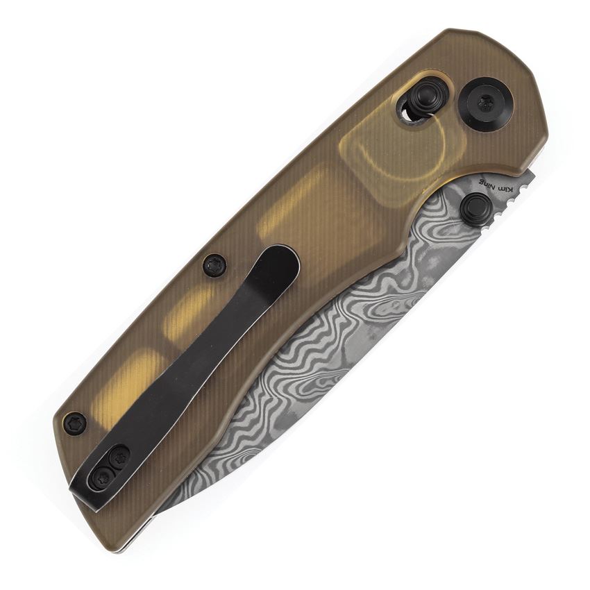 Model/Item/Part Number - T1001V10. Tenable Kryo Damascus Drop Point Crossbar Lock Knife Amber PEI Handle. 4.5" (11.43cm) closed. 3.5" (8.89cm) Damascus steel drop point blade. Amber PEI handle. Thumb stud. Pocket clip. Boxed. Made in China.