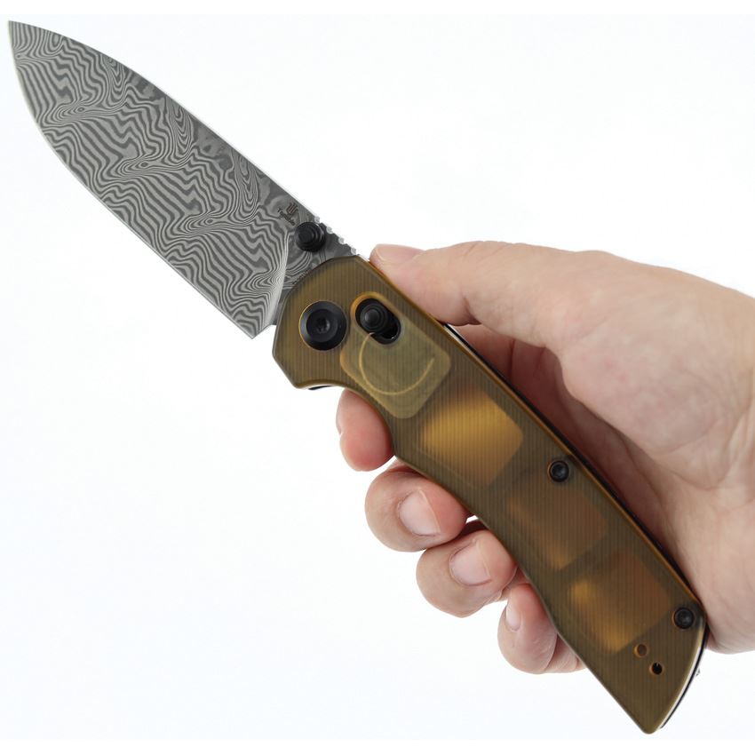 Tenable 1001V10 Kryo Damascus Drop Point Crossbar Lock Knife Amber PEI Handle