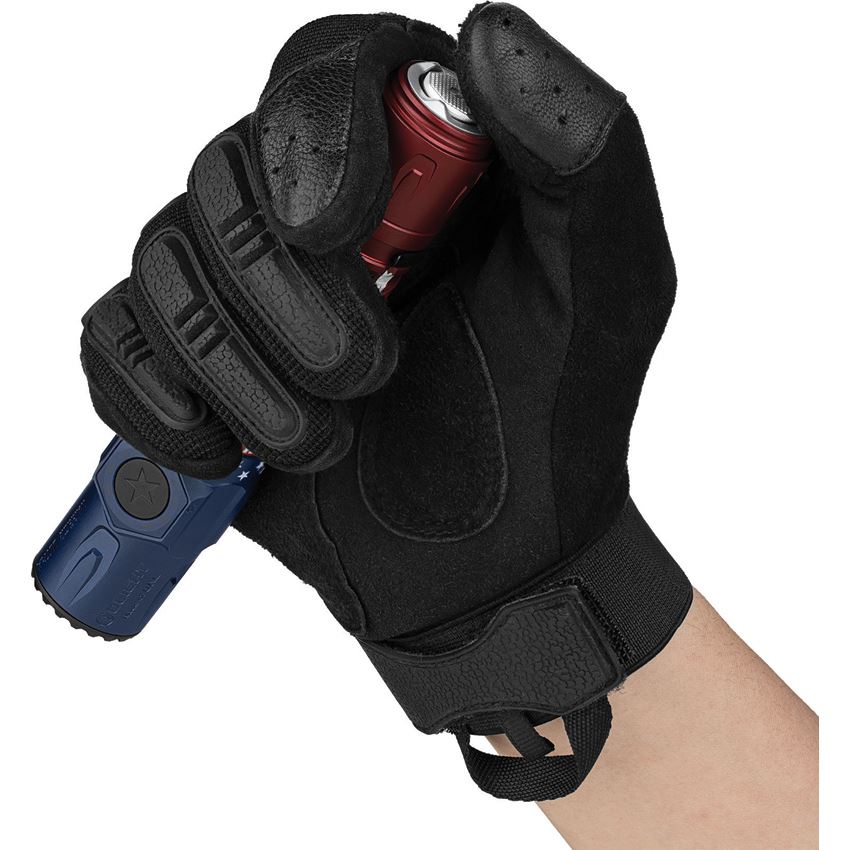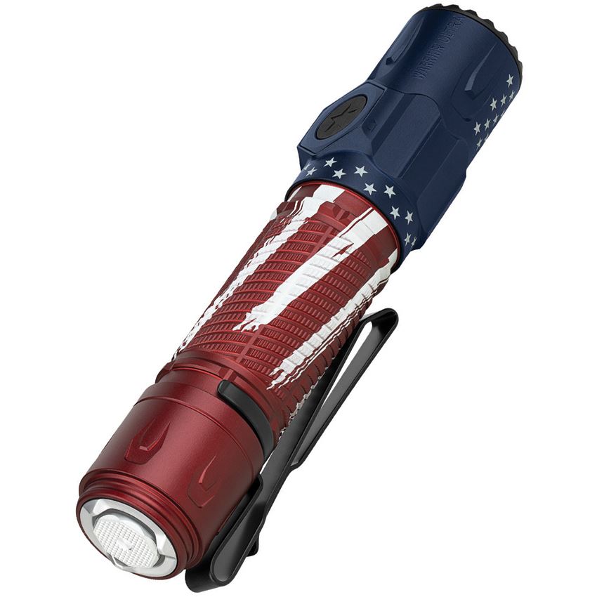 Model/Item/Part Number - OLTWRULTRASTARS. Olight Warrior Ultra Flashlight Stars. 5.5" overall. Clip. Water resistant. Impact resistant. Strobe. Rechargeable. High performance cool white LED. TIR optic lens. Dual switch. Modes: Turbo (2500-800-250 lumens, 2.5+162+39m runtime); High (800-250 lumens, 168+39m runtime); Medium (200 lumens, 13h runtime); Low (15 lumens, 130h runtime); Moon (1 lumen, 55 day runtime). 320m beam distance. MCC3 USB magnetic charging cable. Holster included. Requires (1) 21700 battery (included). O-Aluminum construction. Color: Stars and Stripes. Boxed. Made in China.