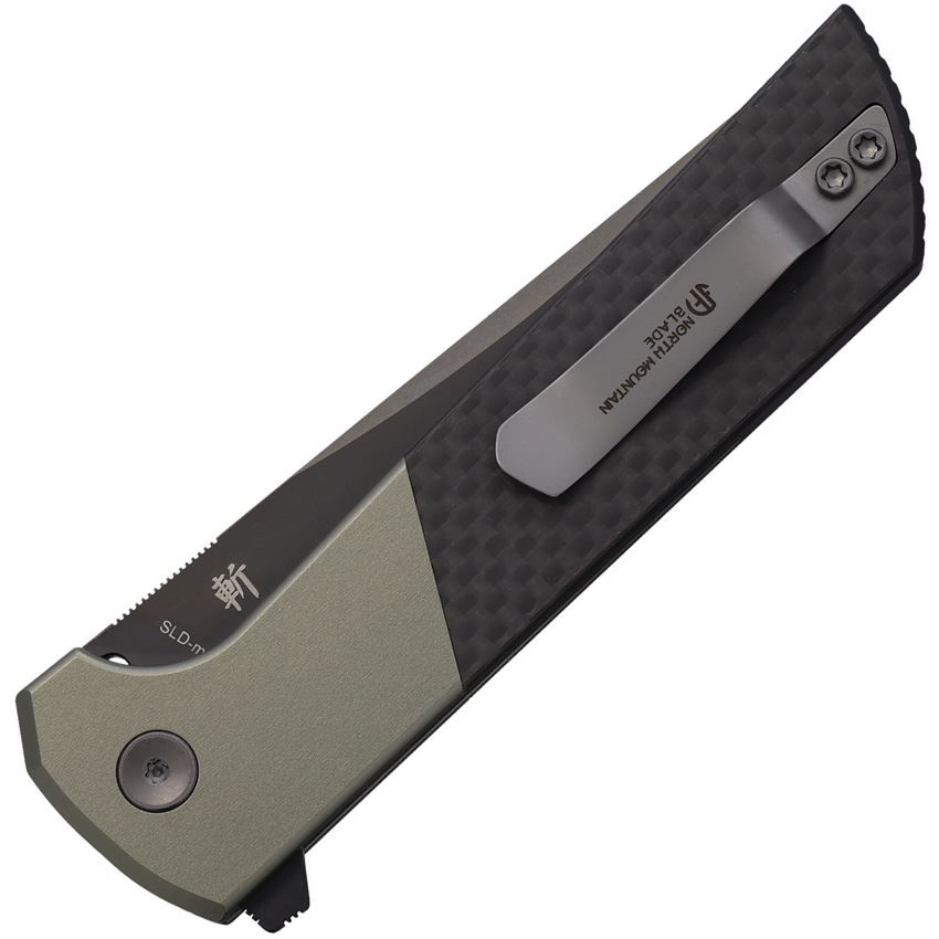 Model/Item/Part Number - NMB2407GRCFD. North Mountain Blade Chop 2 Black DLC Tanto Button Lock Knife Carbon Fiber Handle. 4.5"" (11.43cm) closed. 3.5"" (8.89cm) blade. Carbon fiber handle. Aluminum bolster(s). Extended tang. Pocket clip. Black DLC SLD-Magic SAN MAI tanto blade. Black molded plastic storage case. Boxed. Made in China.