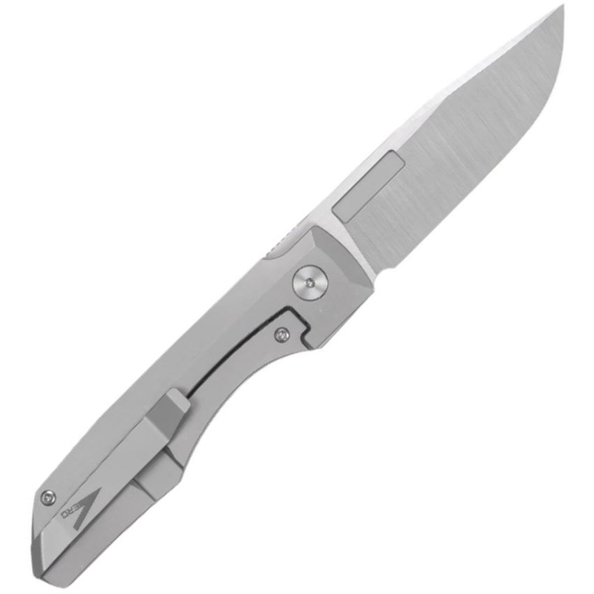 Model/Item/Part Number - VROVITBSS. Vero Engineering Impulse Satin Bohler Drop Point Thin Framelock Knife Stonewash Titanium Handle. 5" (12.7cm) closed. 3.63" (9.22cm) Bohler M390 stainless drop point blade. Stonewash finish titanium handle. Pocket clip. Belt satin finish blade. Boxed. Made in China.