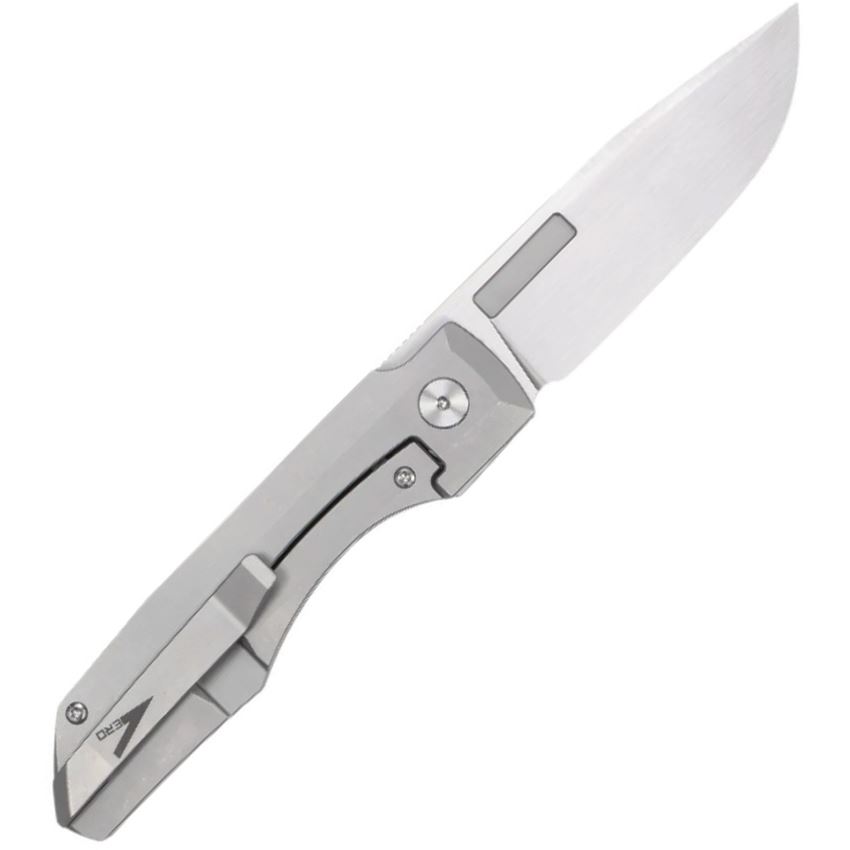 Model/Item/Part Number - VROVITHSS. Vero Engineering Impulse Satin Bohler Drop Point Thin Framelock Knife Stonewash Titanium Handle. 5" (12.7cm) closed. 3.63" (9.22cm) Bohler M390 stainless drop point blade. Stonewash finish titanium handle. Pocket clip. Hand satin finish blade. Boxed. Made in China.