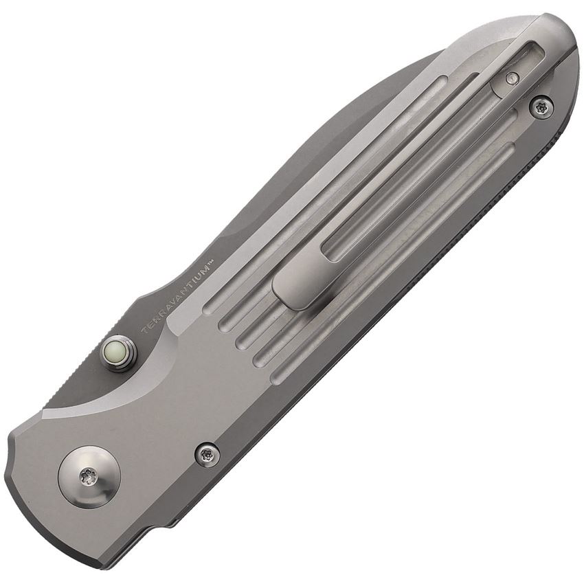 Model/Item/Part Number - TER10528. Terrain 365 Invictus Spear Point Button Lock Knife Gray Titanium Handle. 4.63" (11.76cm) closed. 3.5" (8.89cm) spear point blade. Gray titanium handle. Thumb stud. Pocket clip. Terravantium Dendritic Cobalt blade. C3 GITD thumb stud cabochons. Green nylon zippered storage case. Boxed. Made in China.