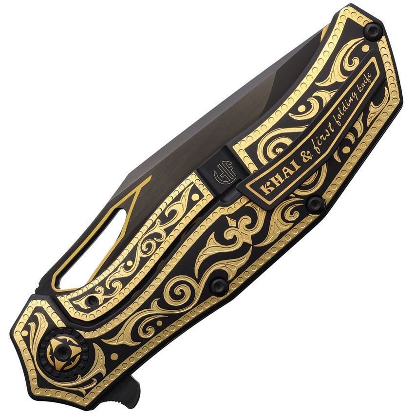 Model/Item/Part Number - NMB2532GDD. North Mountain Blade Gold Nocturne Black DLC Drop Point Linerlock Knife Black Cerakote Handle. 5.25" (13.34cm) closed. 4.25" (10.8cm) black DLC coated 3V steel drop point blade. Black Cerakote handle. 24K gold plate blade and handle accents. Wooden presentation box. Boxed. Made in China.