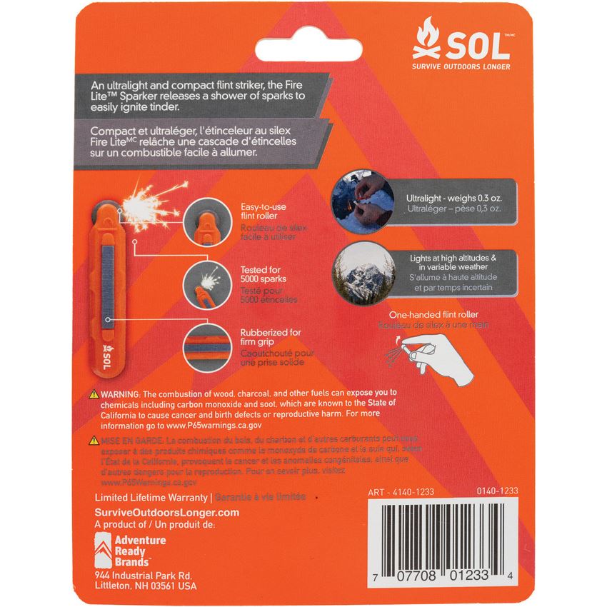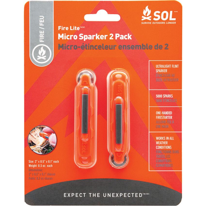 Model/Item/Part Number - AD01401233. Adventure Medical SOL Fire Lite Micro Sparker. 2.5" overall. Pack of two. Easy to use flint roller. Tested for 5000 sparks. Rubberized grip. Works at high altitudes and variable weather. Clam packed. Made in USA.